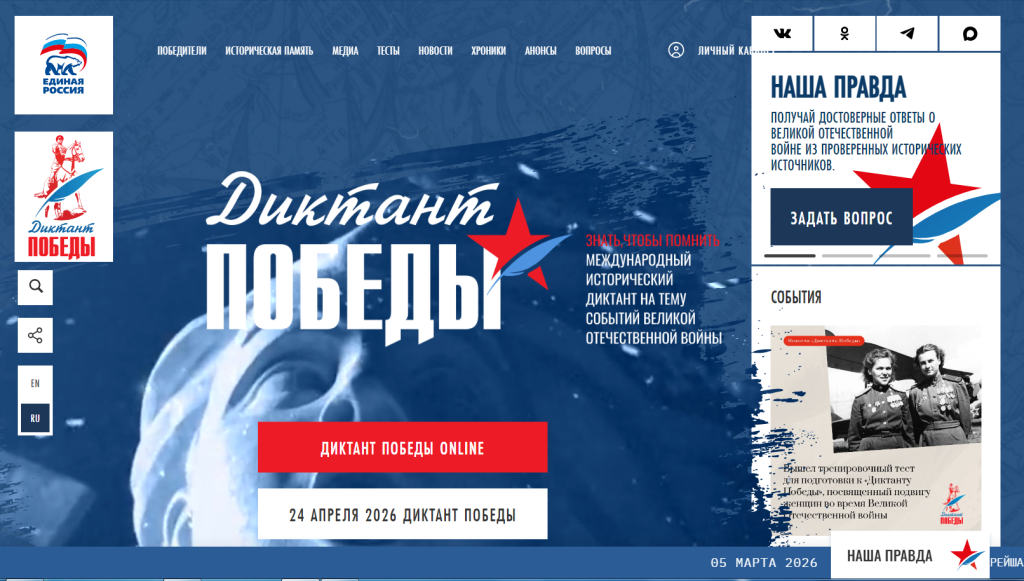25 апреля 2026 года Организационный комитет Всероссийской политической партии «ЕДИНАЯ РОССИЯ» «НАША ПОБЕДА» проводит в России и за рубежом ежегодный Международный исторический диктант на тему событий Великой Отечественной войны 1941-1945 годов – Диктант Победы.
